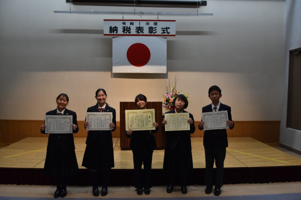 11月16日(木)に本庄商工会議所会館にて、税の作文の表彰式が行なわれました。受賞した本校の5名の生徒が参加し、表彰状を授与されました。作文を通して、税の種類や使われ方について調べ、考え、まとめていくことで、税金によって支えられていることを感じ、税についての関心が高まったと思います。