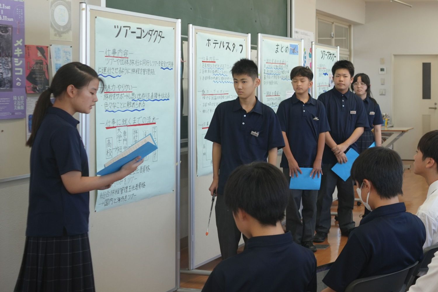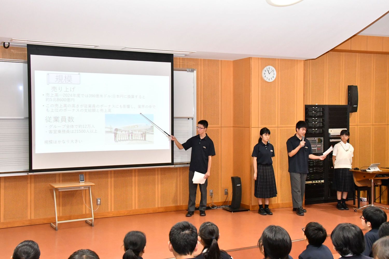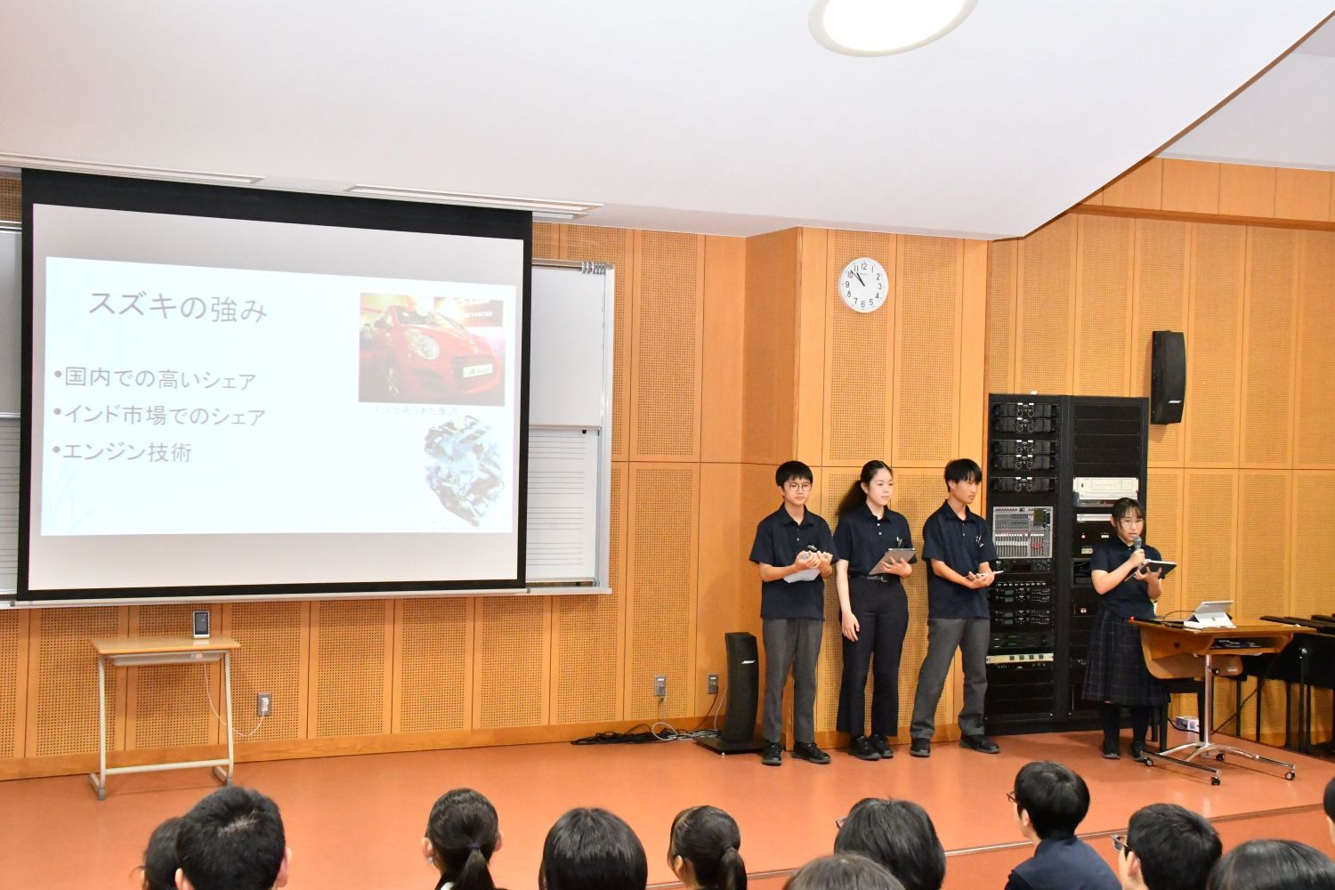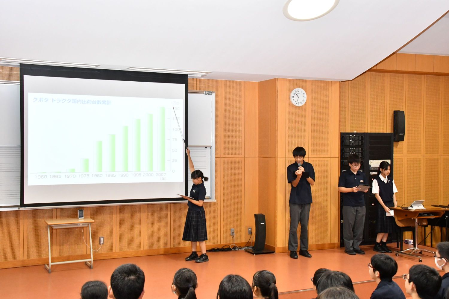 9月7日(日)きりぐるま祭が開催されました。今年も「オープニングセレモニー」として、筝曲部の演奏が行われました。1学年は、職業調べを模造紙にまとめて発表。2学年は、企業調べをもとに新しいビジネスを考えるというテーマの発表。3学年は、最先端の研究内容を調べ、社会課題を解決する方策を提案する「ソーシャルチェンジ」の発表。各学年とも個人で調べるだけではなく、班で話し合い、発表練習を重ねた様子が見られました。