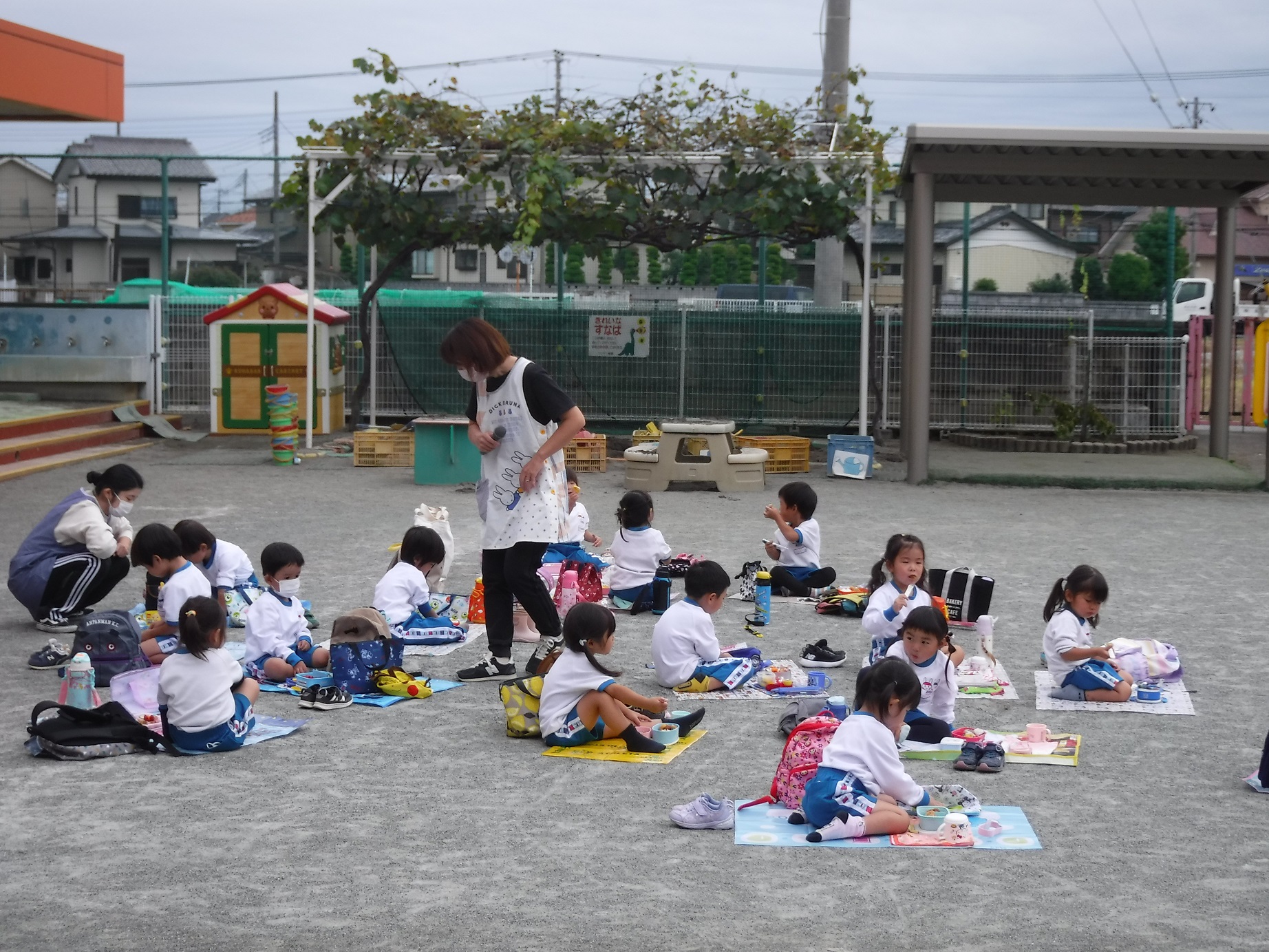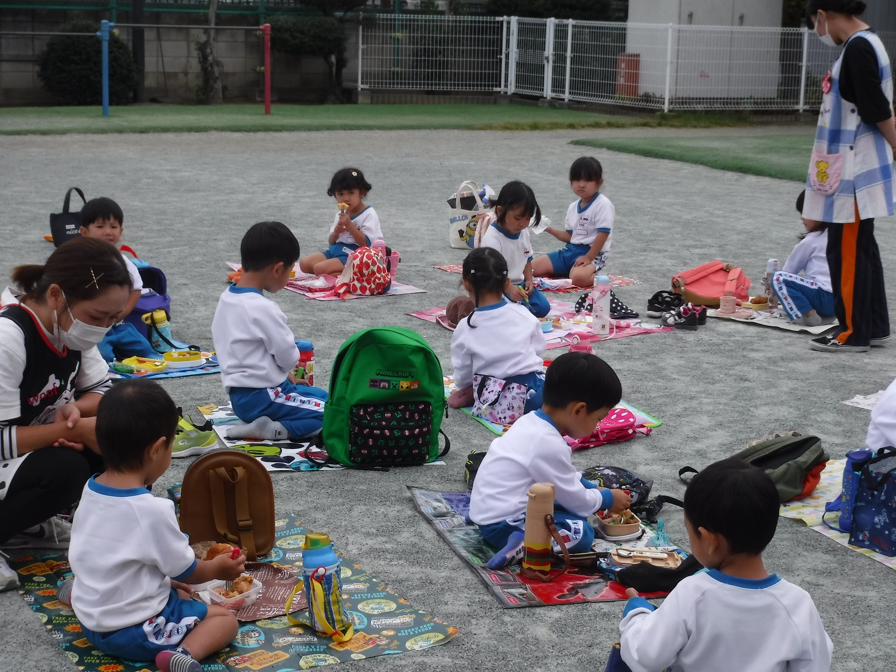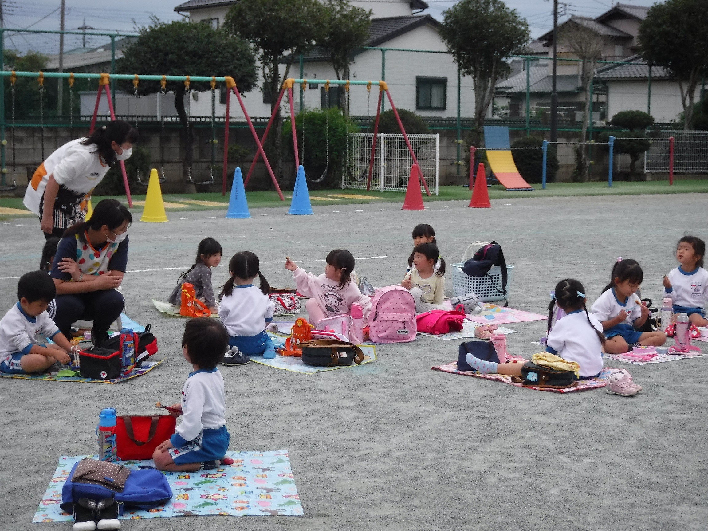 いつもとは違うリュックにお弁当・シートを入れ、水筒を提げての登園です。今日はずっと楽しみにしていたピクニックごっこです。自分でシートを広げてお弁当を食べました。みんなで食べたお弁当。美味しかったですね。
