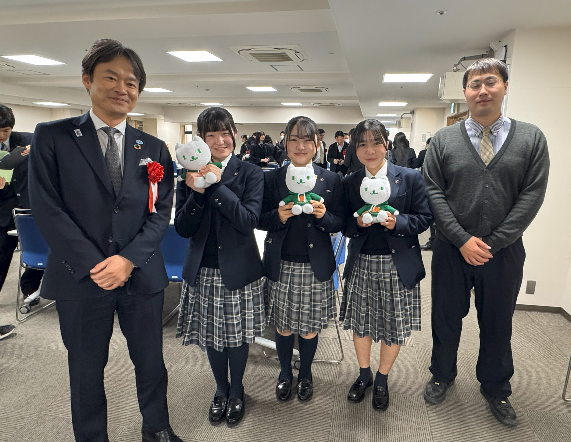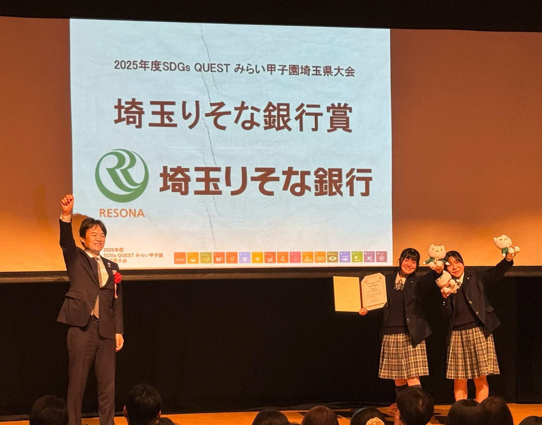 3月8日(日)、SDGsQUESTみらい甲子園埼玉県大会ファイナルセレモニーが上尾市文化センターにて開催されました。これに本校から1チーム(五十嵐結菜、折田いぶき、櫻沢未麓)がファイナリスト12チームとして選出されたため、参加することができました。「埼玉りそな銀行賞」を受賞した瞬間、生徒たちは大歓喜。忘れることのできない一日となったようです。